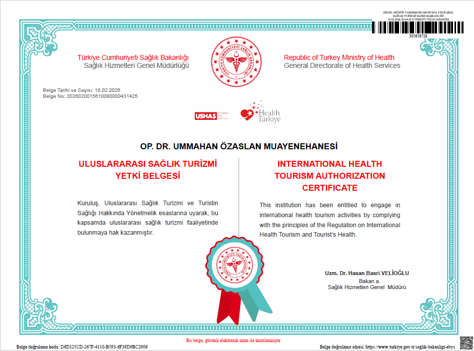 Kliniğimiz, T.C. Sağlık Bakanlığı tarafından verilen Uluslararası Sağlık Turizmi Yetki Belgesine sahiptir. Bu belgeyle, yurt dışından gelen hastalarımıza güvenli, yasal ve kaliteli sağlık hizmeti sunma yetkisine sahibiz.